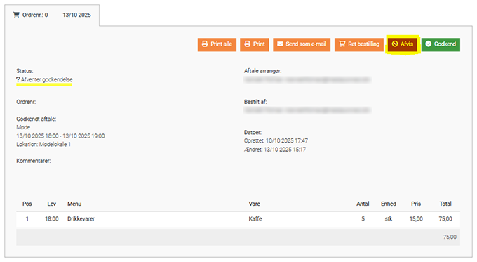 - Tryk på Afvis knappen, for at afvise ordren.