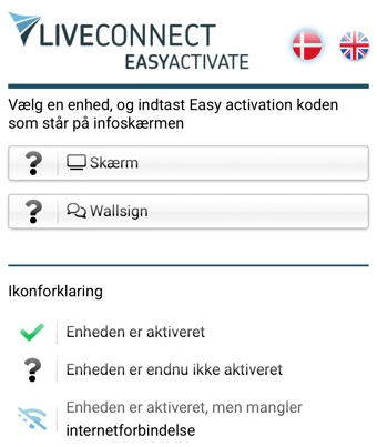 - Indtaste afspillerens (LiveBoxens) Easy Activate aktiveringskode fra skærmen, på enheden i LiveConnect.