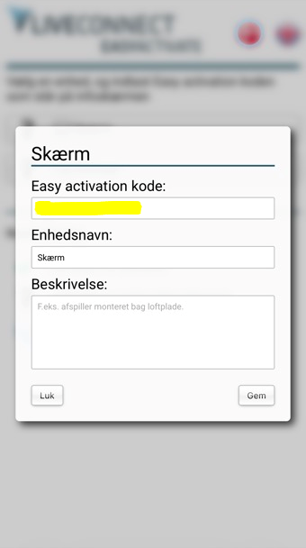 Indtast Easy Activate aktiveringskode for afspilleren (LiveBoxen) under Easy activation kode.