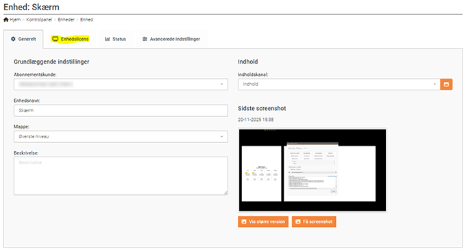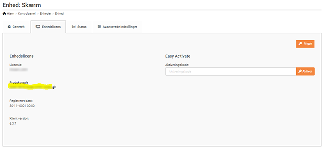 - Aflæs licensen (produktnøglen) for enheden under Produktnøgle.