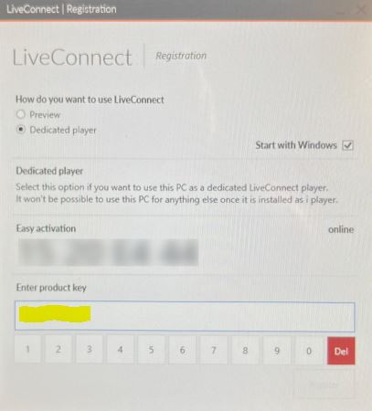 Hver enhed i LiveConnect har en licens (produktnøgle), som er unik for den enhed i hele LiveConnect, og for at forbinde enheden i LiveConnect med afspilleren (LiveBox), så indtastes enhedens licensen (produktnøglen) på afspilleren (LiveBox). Når licensen (produktnøglen) bliver indtastet på en afspiller (LiveBox), så bliver den registreret som værende i brug, og kan ikke bruges på andre afspillere samtidig med, for at sikre at kun en specifik afspiller (LiveBox) viser en specifik enheds indholdskanal.