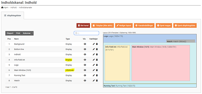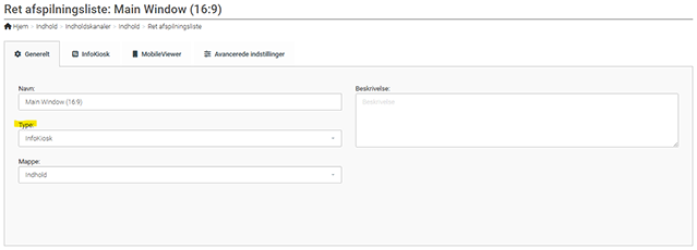 - For at skifte typern af afspilningsliste fra Display til InfoKiosk skal du trykke på Ret knappen ud for afspilningslisten.