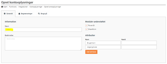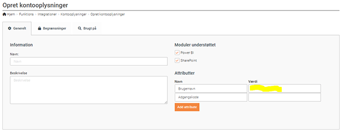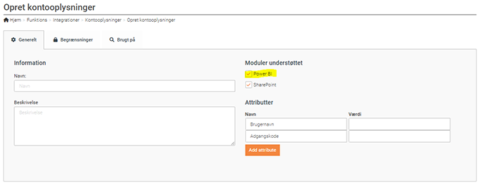 Inden du opretter et Power BI medie, så skal du oprette Kontooplysninger for den brugerkonto, som har adgang til Power BI rapporten i Power BI tjenesten, hvilket du gør på følgende måde: