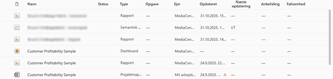 Tryk på Arbejdsområder for at åbne oversigten over arbejdsområder det arbejdsområde hvor Power BI rapporten er oprettet i.