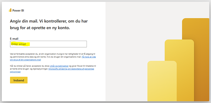 (NB! Vi anbefaler at du opretter en "Servicebrugerkonto" i Power BI, således at brugerkontoen ikke er knyttet til nogen konkret person/ansat, men kun bruges til at opnå adgang til Power BI rapporten i Power BI tjenesten.)