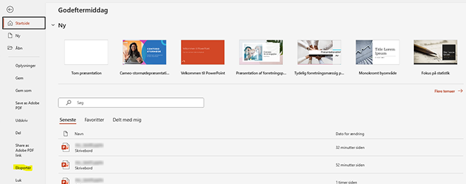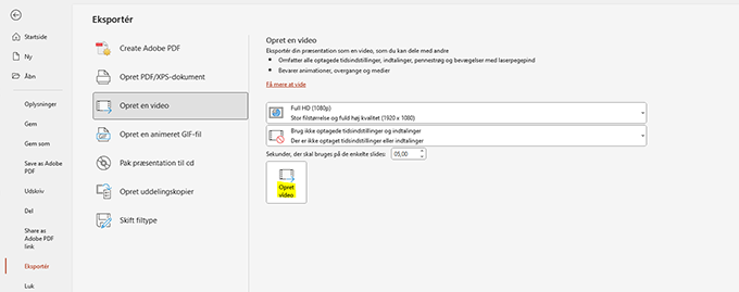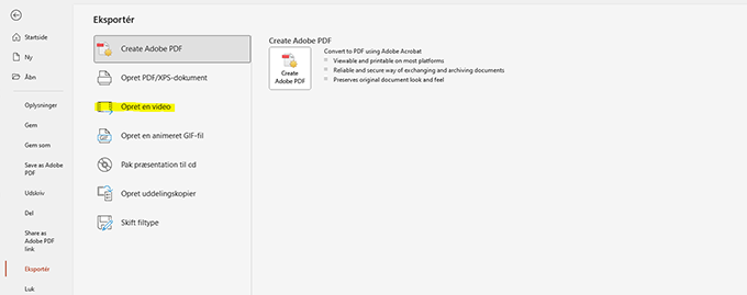 For at eksportere et PowerPoint dokument som en video-fil, skal du gøre følgende: