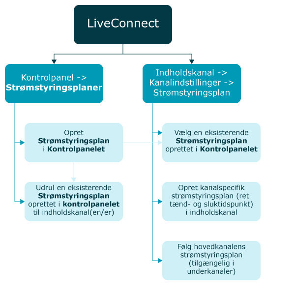 En strømstyringsplan kan enten oprettes som en Strømstryringsplan, under Kontrolpanelet i LiveConnect, og kan så udrulles og bruges på mange indholdskanaler på én gang, eller det er muligt på den enkelte indholdskanal at vælge en eksisterende Strømstryringsplan, eller at oprette en Kanalspecifik strømstyringsplan, som er specifik for den enkelte indholdskanal.